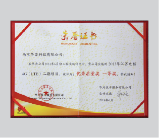 2014年江苏电信4G(LTE)二期项目“优异质量奖 一等奖”